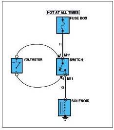 A. Connect one lead of a test lamp or voltmeter to a ground. If you are using a voltmeter, be sure it is the voltmeter's negative test lead you have connected to ground.