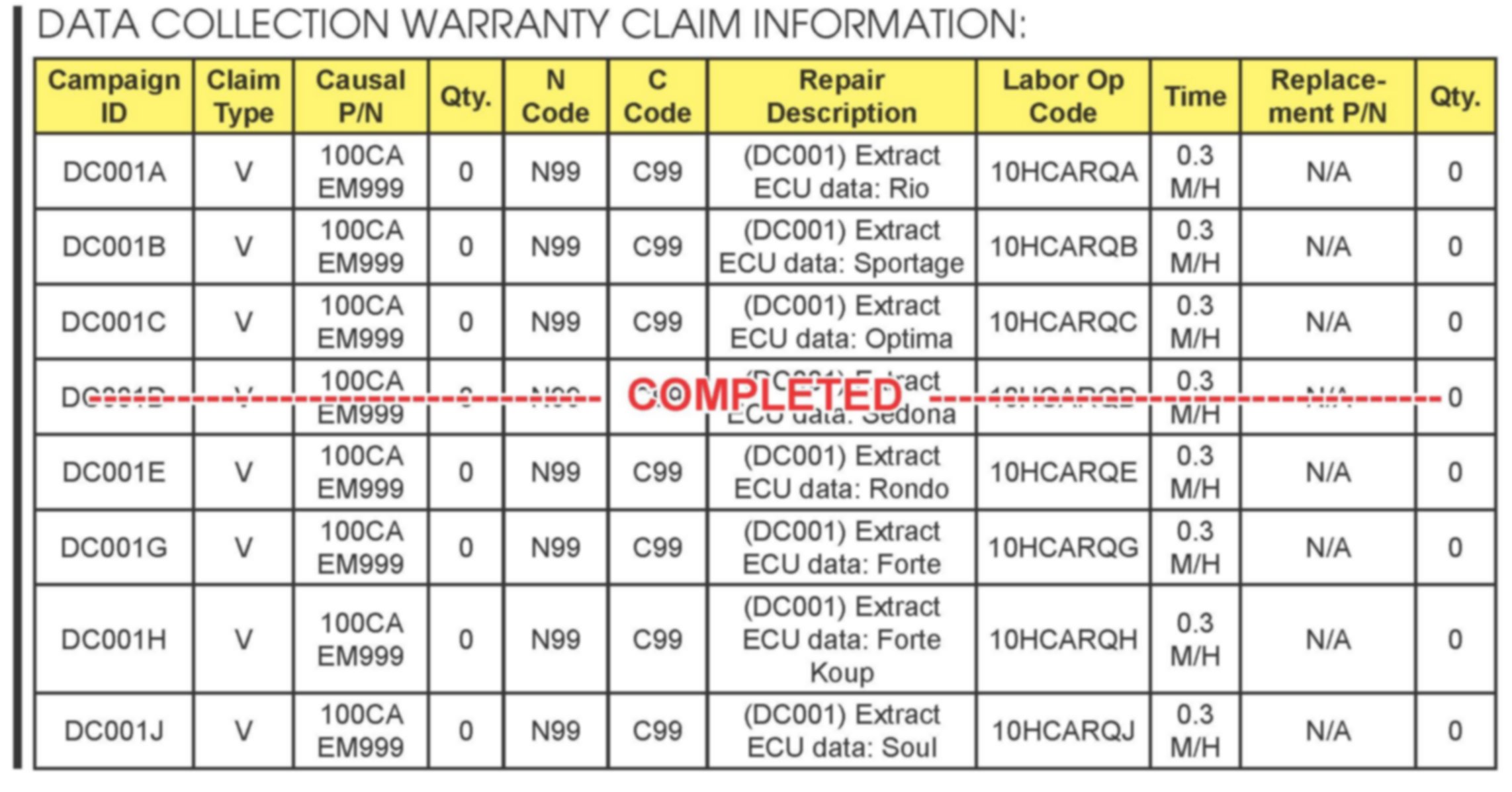 VIN inquiry data for this repair is provided for tracking purposes only. Kia retailers should reference DC001 when accessing the WebDCS system.