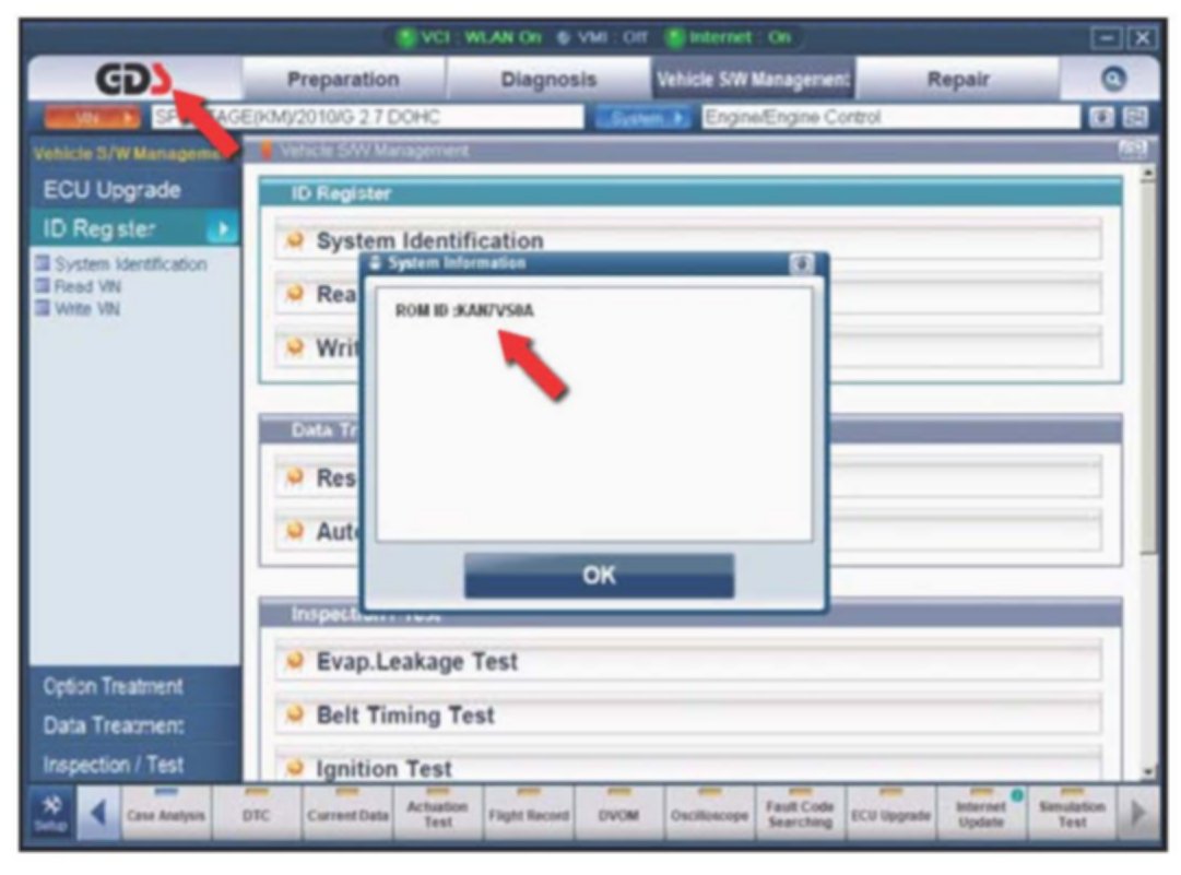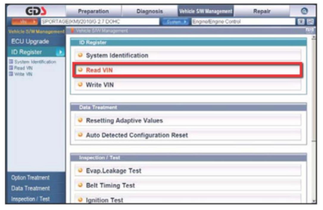 4. To verify the VIN, select "Read VIN" under the "Vehicle S/W Management" menu. Click "OK" and write down the VIN for later form entry.