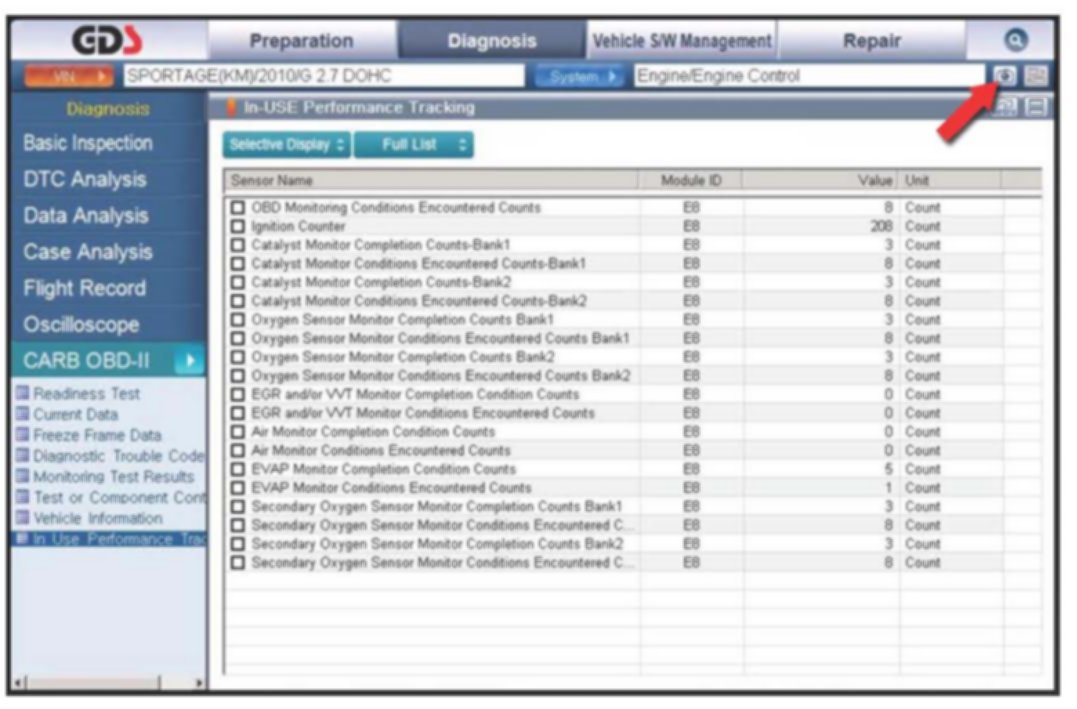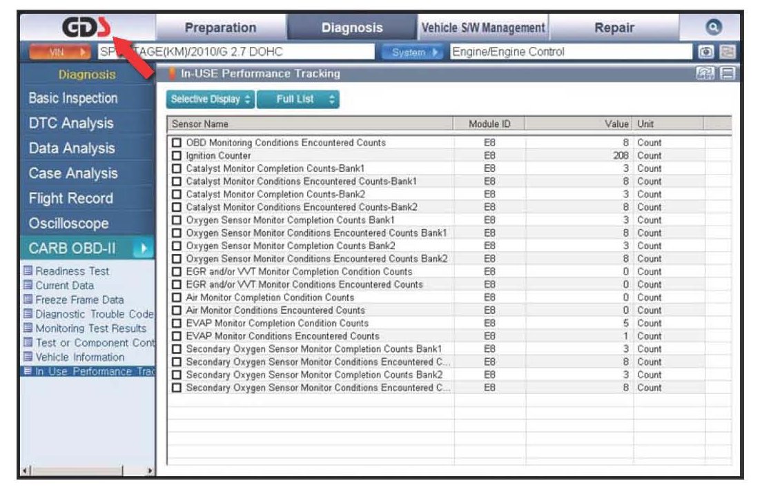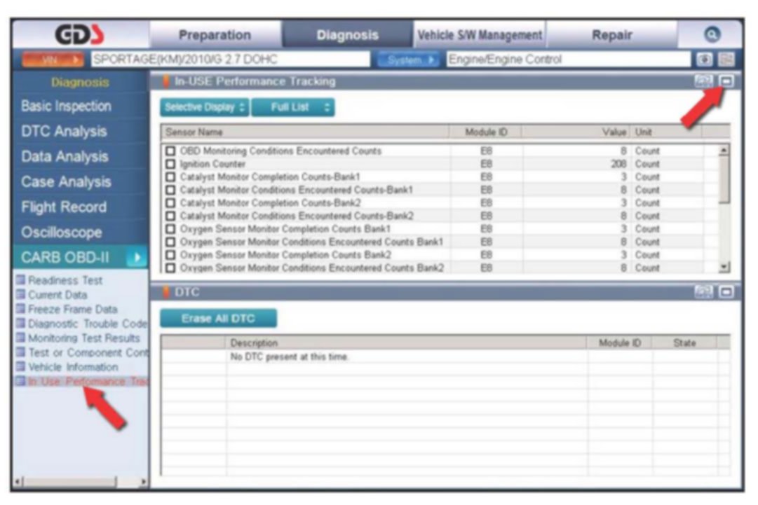 7. Click on "IN-USE Performance Tracking" found in the CARB OBD-II list at the bottom left of the screen. Then click the "Expand" button at the top right corner of "IN-USE Performance Tracking" window.