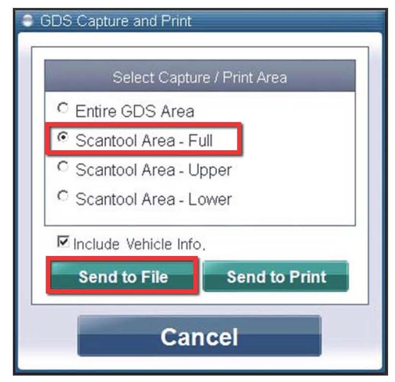 9. Select "Scantool Area - Full" and click "Send to file". The GDS will set up a designation folder and file name to save the captured data. Please change the file name to include the model/engine, the last 6 of the VIN and the date (mmddyyyy). Before saving, write down the file name and designation folder for further reference.
