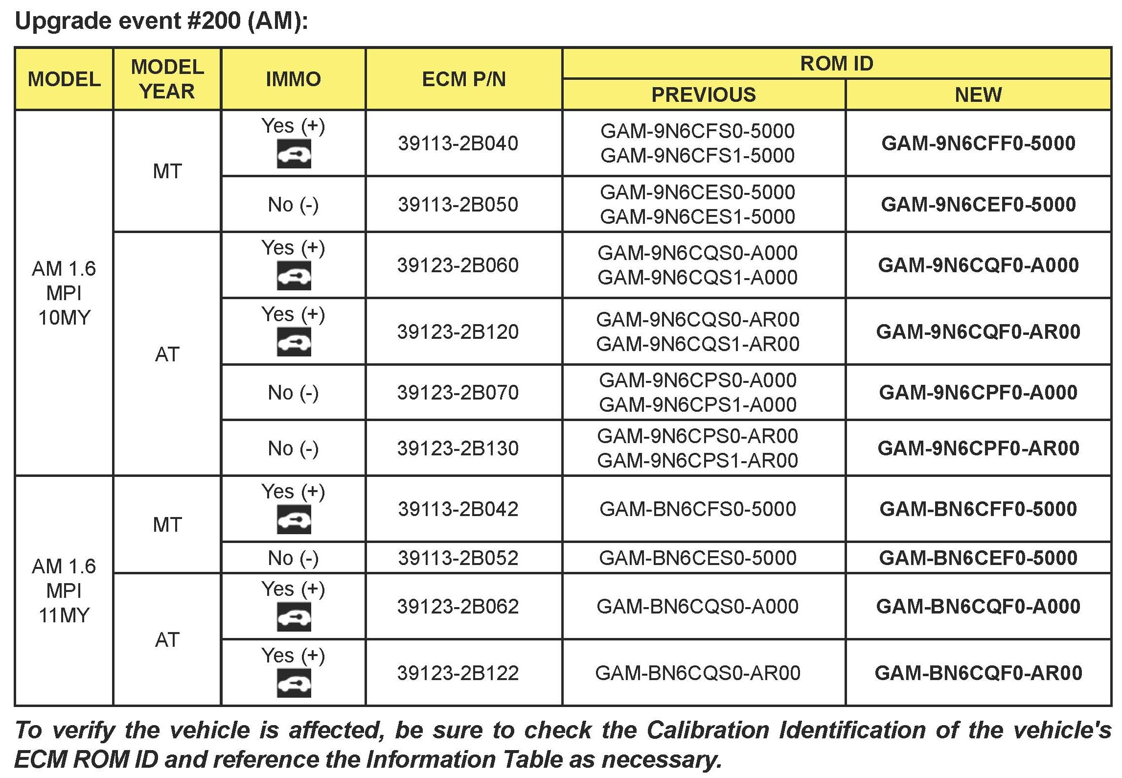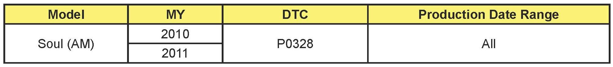This bulletin provides information related to the ECM software upgrade for some 2010-2011 MY Soul (AM) 1.6L vehicles which may experience a malfunction indicator lamp (MIL) illuminated with the Electronic Control Module (ECM) system-related DIG P0328. To correct this condition, the ECM should be reprogrammed using the GDS download as described in this bulletin. Before performing this procedure, verify the VIN falls within the production range by consulting the table. For confirmation that the latest reflash has been done to a vehicle you are working on, verify ROM ID using the tables in this TSB.