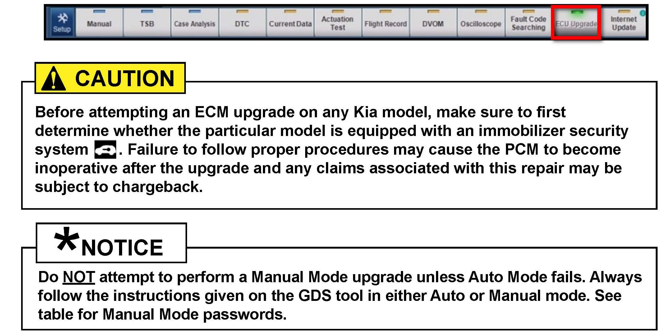 7. Once back at the GDS Main Screen, select ECU Upgrade from the bottom right-hand corner. Next select Auto Mode, and then Engine. Perform the ECM upgrade in accordance with normal GDS tool ECM upgrade procedures.