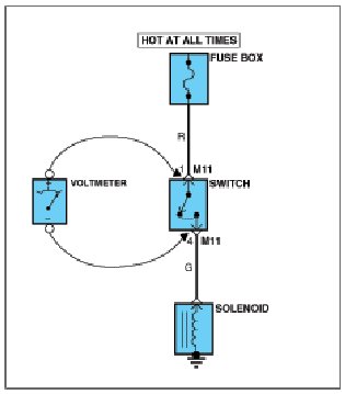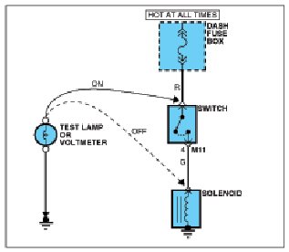 A. Connect one lead of a test lamp or voltmeter to a ground. If you are using a voltmeter, be sure it is the voltmeter's negative test lead you have connected to ground.