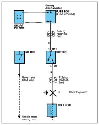 A short finder is available to locate a short to ground. The short finder creates a pulsing magnetic field in the shorted circuit and shows you the location of the short through body trim or sheet metal.