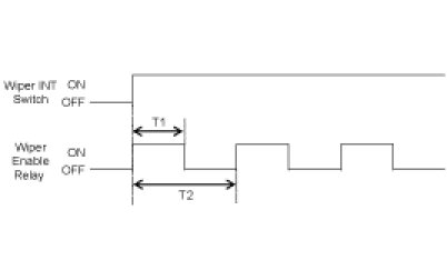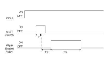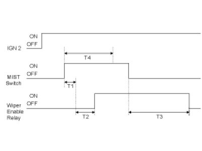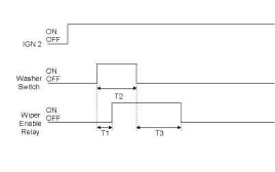 (1) Turn Wiper Enable Relay ON after T1 when turning Washer switch ON at the status of IGN2 ON and if the input of Washer switch is between 0.06 and 0.2sec, turn the output of Wiper Enable Relay OFF after T3.But, ignore the input of Washer switch occurred while Wiper Enable Relay is being operated and accept it from the input of Washer switch after operating Wiper Enable Relay.