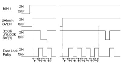 (2) On condition of IGN1 switch ON, turn Door Lock Relay output ON within T1 when keeping more than setting speed in (1). But, do not output LOCK if all DOORS are LOCKED or FAIL at first.