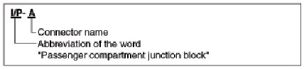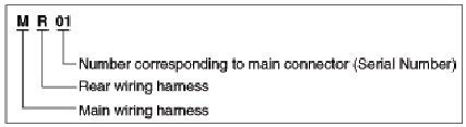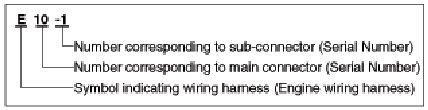 A Connector identification symbol consists of a wiring harness location classification symbol corresponding to a wiring harness location and number corresponding to the connector.