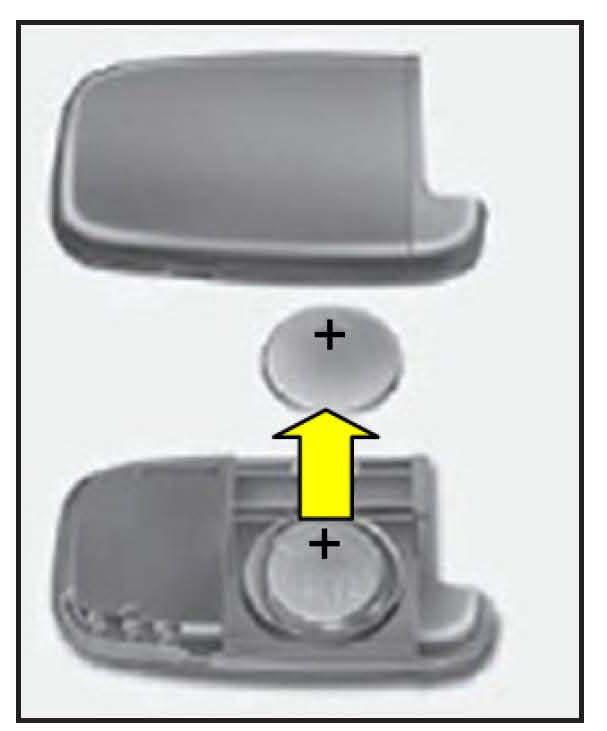 1. Replace the battery with a new battery (CR2032). When replacing the battery, make sure the battery positive "+" symbol faces up as indicated in the illustration.