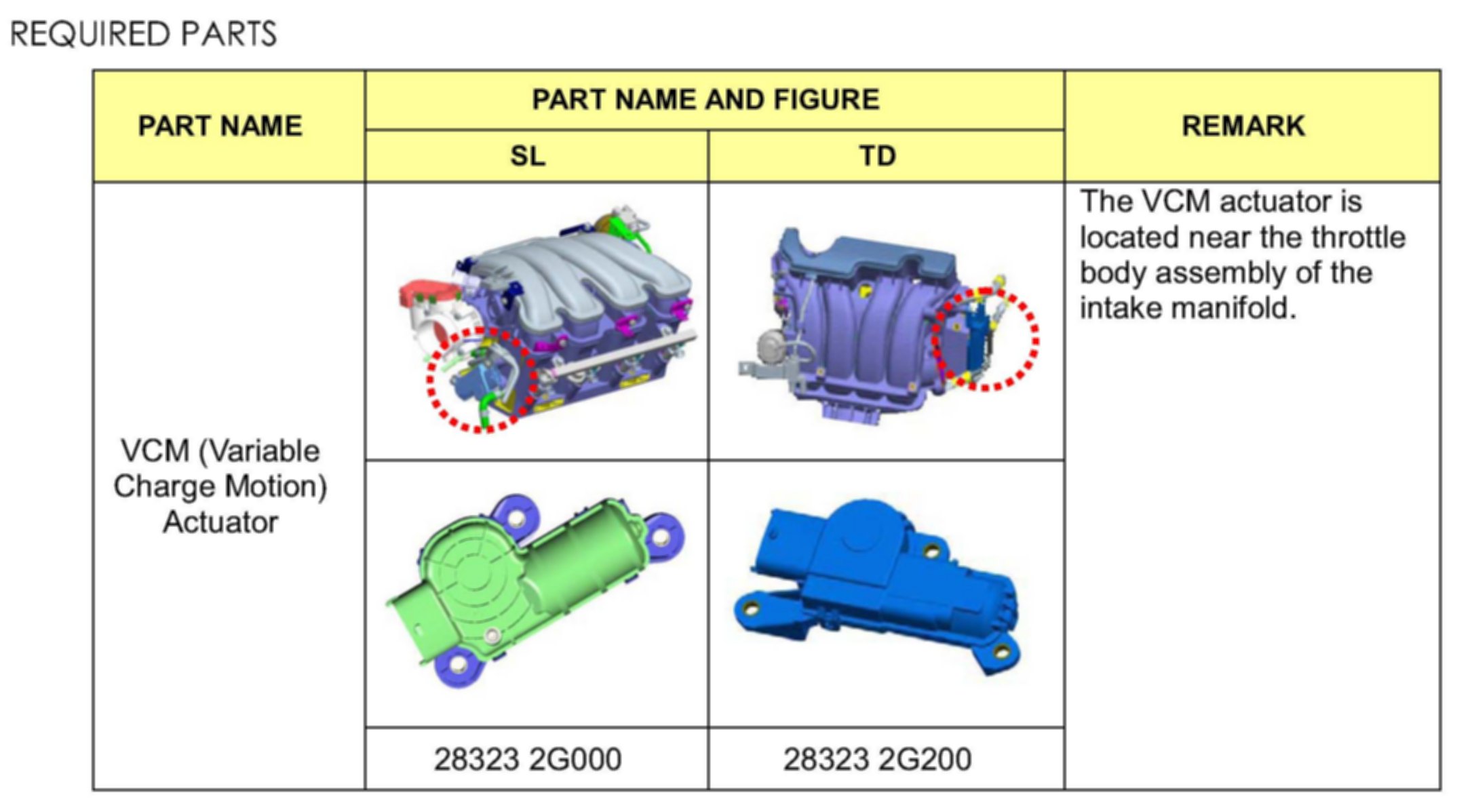 This bulletin provides information related to the VCM (Variable Charge Motion) actuator replacement and the ECM software upgrade of some 2011-2012MY Forte/Forte Koup (TD) 2.0/2.4L vehicles produced from August 19, 2010 to May 31, 2011 / June 1, 2011 to August 10, 2011, and some 2011MY Sportage (SL) 2.4L vehicles produced from June 10, 2010 to March 10, 2011 which may experience a MIL (Malfunction Indicator Lamp) illuminated with the ECM (Electronic Control Module) system-related DTC P200A. To correct this condition, the VCM actuator needs to be replaced and the ECM should be reprogrammed using the GDS download as described in this bulletin. For confirmation that the latest reflash has been done to a vehicle you are working on, verify ROM ID using the tables in this TSB.