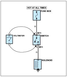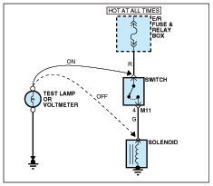 A. Connect one lead of a test lamp or voltmeter to a ground. If you are using a voltmeter, be sure it is the voltmeter's negative test lead you have connected to ground.