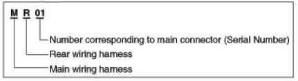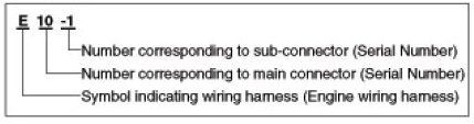 A Connector identification symbol consists of a wiring harness location classification symbol corresponding to a wiring harness location and number corresponding to the connector.