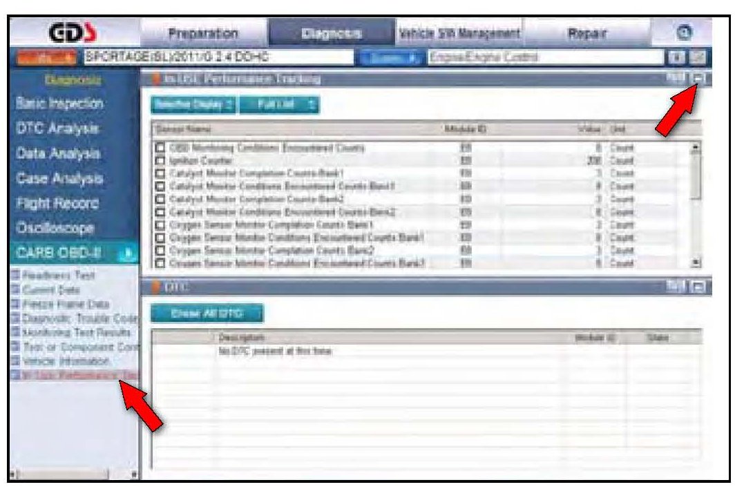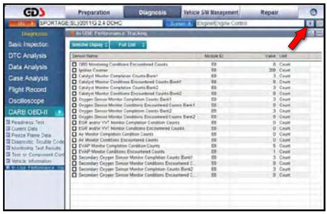 7. Click on "IN-USE Performance Tracking" found in the CARB OBD-II list at the bottom left of the screen. Then click the "Expand" button at the top right corner of "IN-USE Performance Tracking" window.