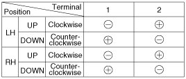3. Connect the motor terminals directly to battery voltage (12V) and check that the motor operates smoothly. Next, reverse the polarity and check that the motor operates smoothly in the reverse direction. If the operation is abnormal, replace the motor.