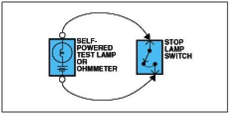 B. Connect one lead of a self-powered test lamp or ohmmeter to one end of the part of the circuit you wish to lest. If you are using an ohmmeter, hold the leads together and adjust the ohmmeter to read zero ohms.