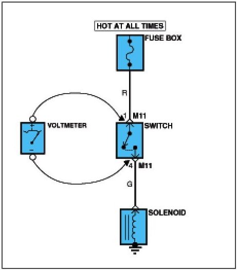 A. Connect one lead of a test lamp or voltmeter to a ground. If you are using a voltmeter, be sure it is the voltmeter's negative test lead you have connected to ground.