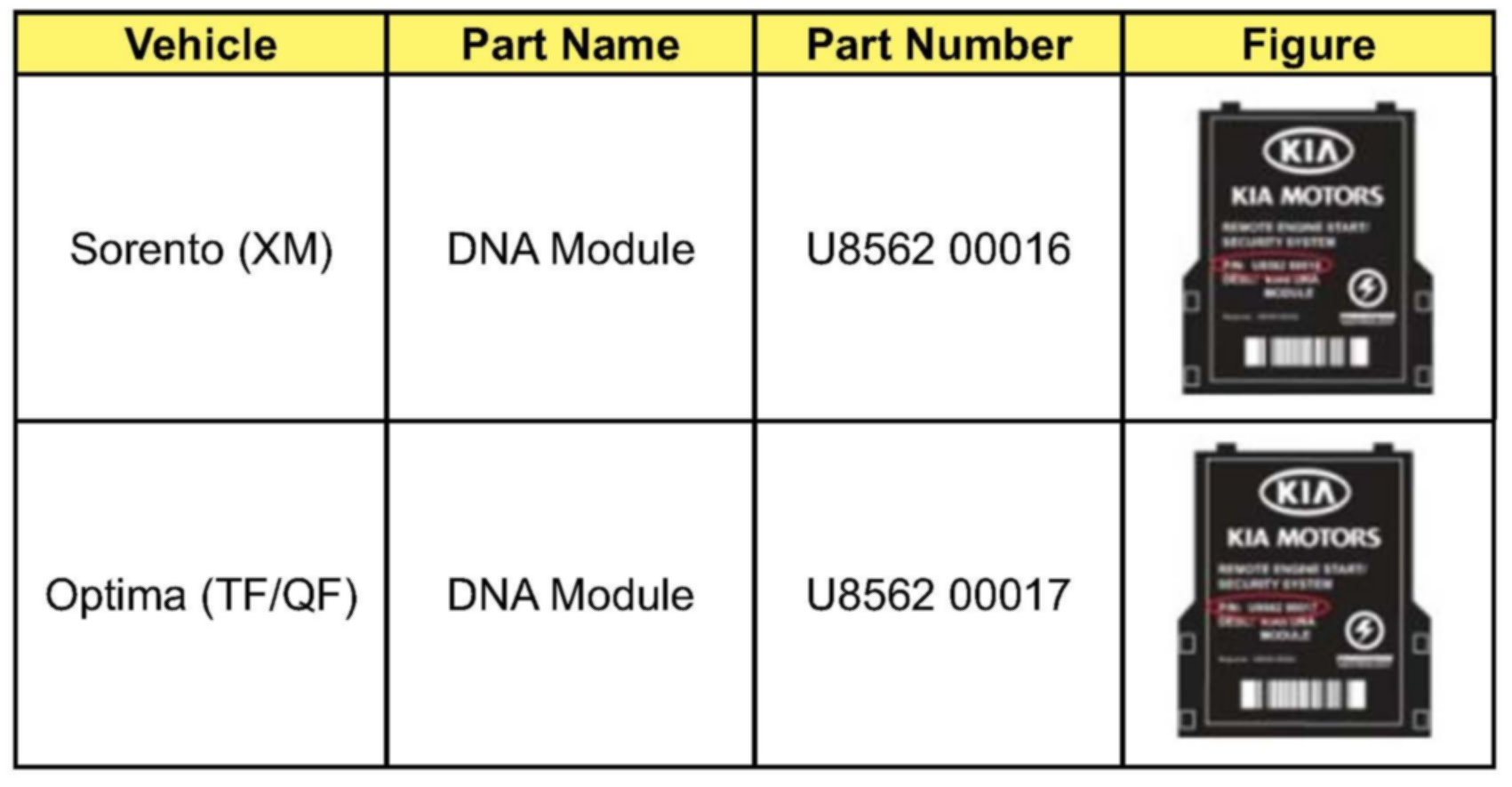 This bulletin provides information relating to some 20111/2012MY Sorento (XM) and Optima (TF/QF) vehicles that are equipped with the remote start option (Sorento P/N U8560 1U001/2 and Optima P/N 2T056 ADU00) as supplied from Job #1 to October 6, 2011. In some of these vehicles the Remote Start System may not always start the vehicle on the first attempt and when the start attempt fails the security system gets triggered. Once the security system is disarmed/unlocked a second attempt is required to start the vehicle. This bulletin provides a repair for this concern by replacing the DNA module in the Remote Start System with an updated version. (Remote Start Systems installed after October 6, 2011 use a new kit [Sorento P/N U8560 1U003 and Optima P/N 2T056 ADU01] that already incorporates this update).