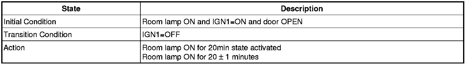 (6) C05: If (ACC=ON or IGN1=ON or IGN2=ON) or (Burglar Alarm state = 1->0) or (Any door close -> open or Tailgate open switch=ON then room lamp auto cut = ON and 20mins timer stop and 3sec timer stop.