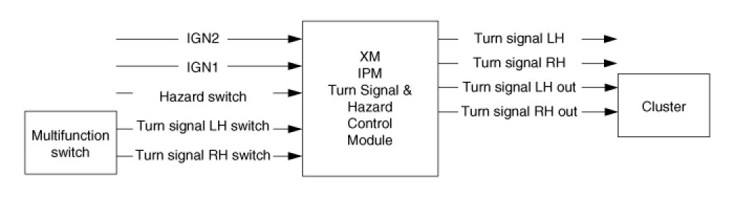 If the Left (or Right) turn switch is active and if IGN2 is On, the left (or Right) turn signal outputs are driven. The turn signal is active as long as both conditions ((Turn Signal LH switch or L_Turn Signal RH switch = On) and IGN2 = On) are true and is turned Off when one of these conditions is no longer detected.