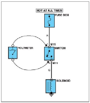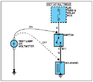 A. Connect one lead of a test lamp or voltmeter to a ground. If you are using a voltmeter, be sure it is the voltmeter's negative test lead you have connected to ground.