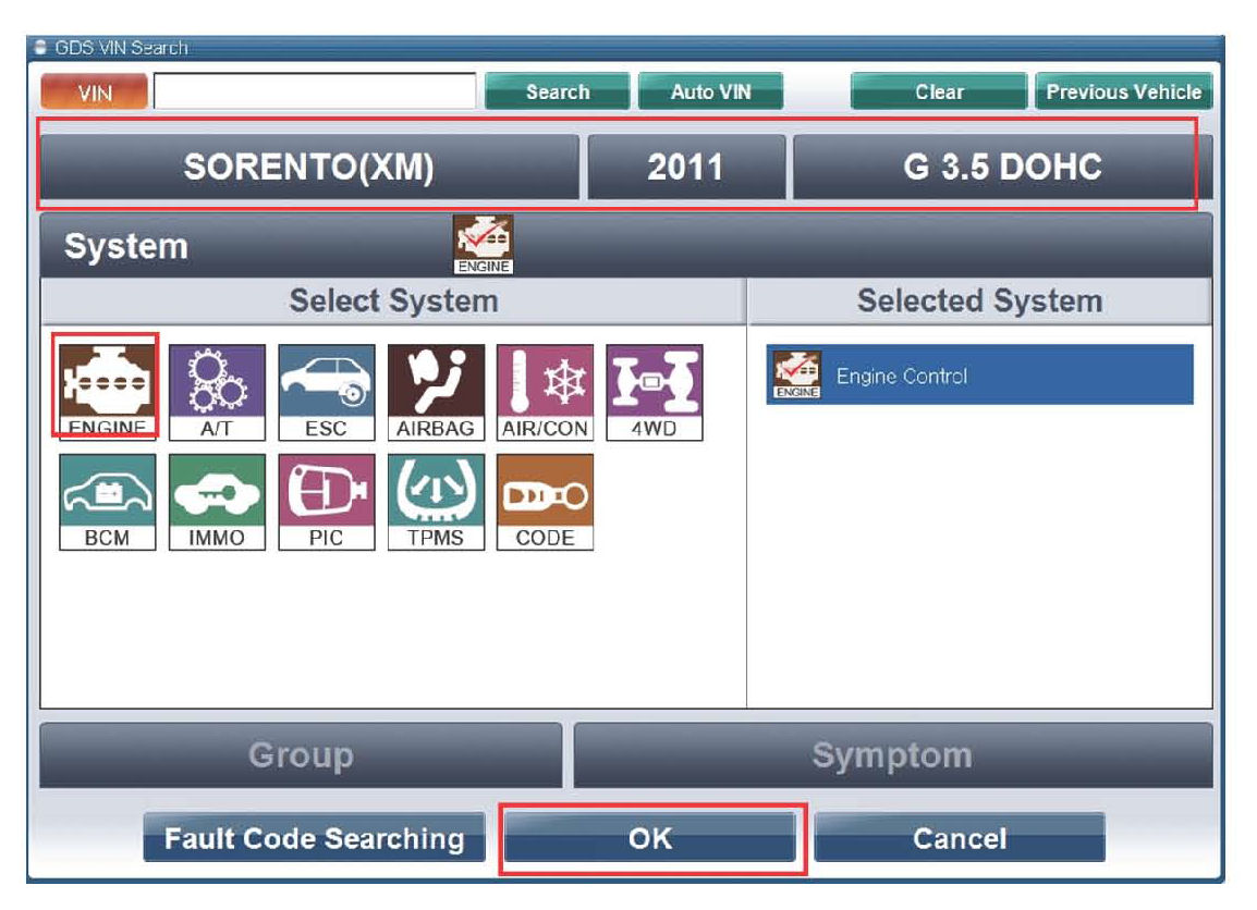 5. With the ignition key ON turn ON the VCI and GDS tool. Access the GDS vehicle identification number (VIN) screen and configure the vehicle using the VIN AUTO DETECT Function.