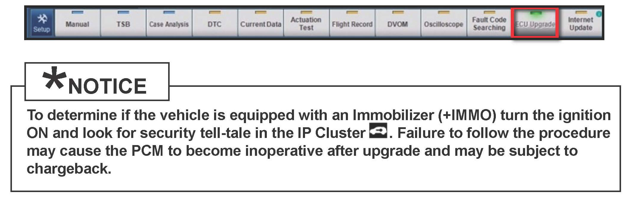 6. Once back at the GDS Main Screen select ECU Upgrade from the bottom right-hand corner Next select Auto Mode and then Engine. Perform the PCM upgrade in accordance with normal GDS tool PCM upgrade procedures
