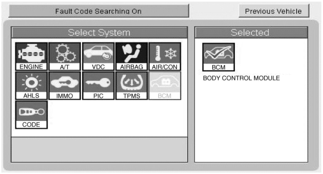 2. To diagnose the BCM function, select the menu of model and body control module.
