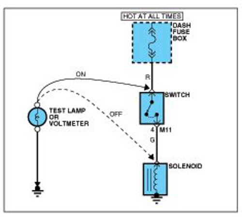 A. Connect one lead of a test lamp or voltmeter to a ground. If you are using a voltmeter, be sure it is the voltmeter's negative test lead you have connected to ground.