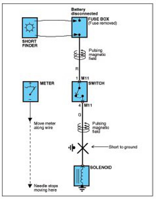 A short finder is available to locate a short to ground. The short finder creates a pulsing magnetic field in the shorted circuit and shows you the location of the short trough body trim or sheet metal.