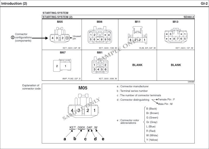 - It shows the front of the connector on the harness side when not to the harness connector. The terminal number on each connector can be obtained by following the pattern used in (5) connector view and numbering order. Unused terminals are marked with an asterisk (*).