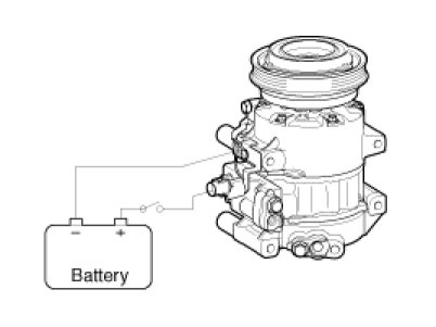 4. Check operation of the magnetic clutch.Connect the compressor side terminals to the battery (+) terminal and the ground battery (-) terminal to the compressor body.Check the magnetic clutch operating noise to determine the condition.