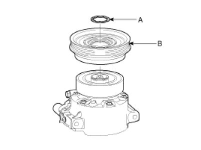 - Be careful not to damage the pulley (B) and compressor during removal/installation.