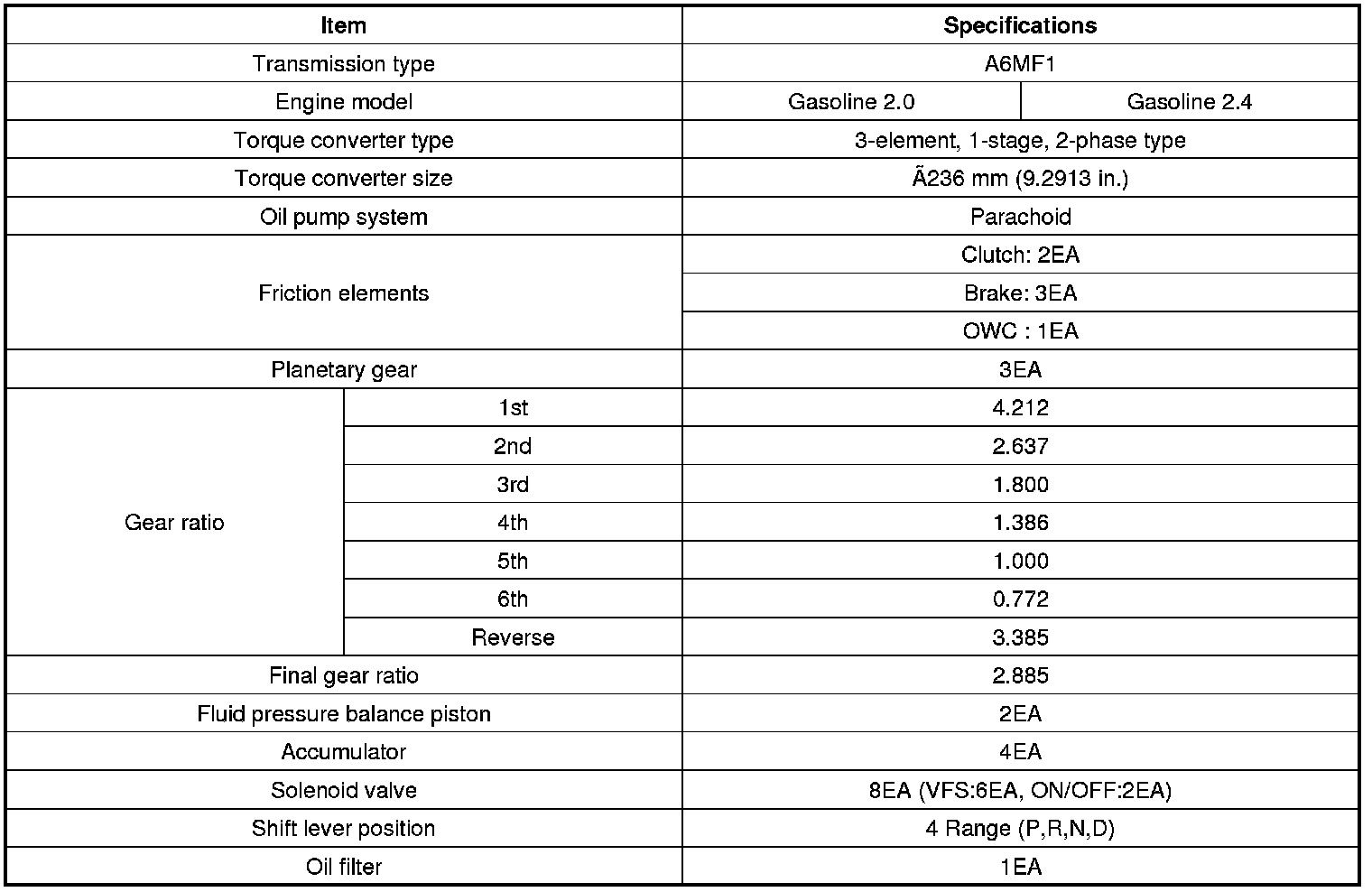 Home >> Kia >> 2012 >> Forte L4-2.4L >> Repair and Diagnosis >> Specifications >> Mechanical Specifications >> Automatic Transmission/Transaxle >> System Specifications