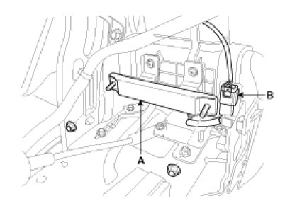 3. Disconnect the interior 2 antenna connector(B) located at the console rear side, then remove the interior 2 antenna(A) after loosening nuts (2EA).