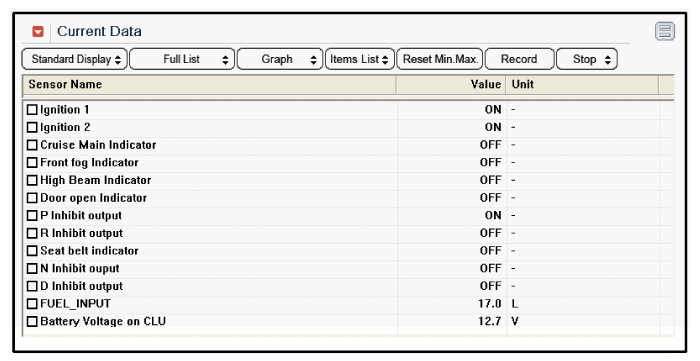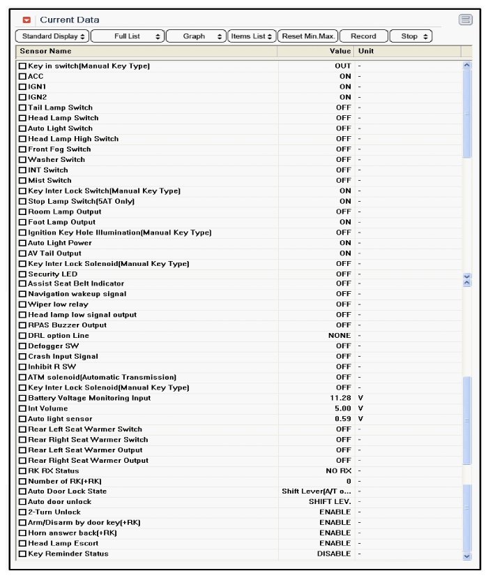 3. To consult the present input/output value of BCM, "Current DATA". It provides information of BCM input/output conditions of power supply, turn signal/brake lamp, headlamp, door, locks, outside mirror, wiper, auto-light and transmitters etc.