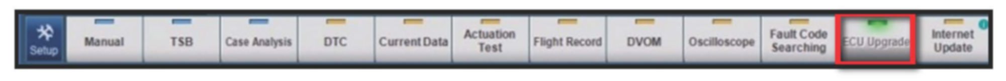 6. Once back at the GDS Main Screen, select ECU Upgrade from the bottom right-hand corner. Next select Auto Mode, and then Engine. Perform the ECM upgrade in accordance with normal GDS tool ECM upgrade procedures.