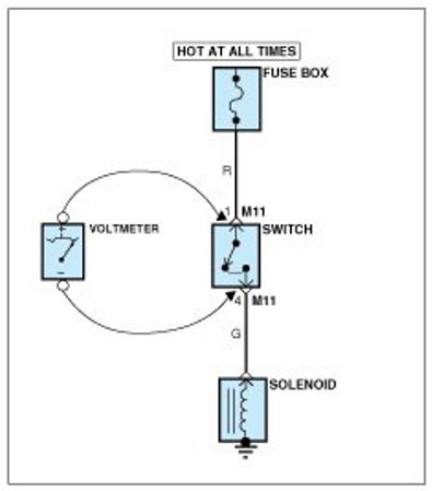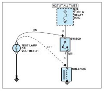 A. Connect one lead of a test lamp or voltmeter to a ground. If you are using a voltmeter, be sure it is the voltmeter's negative test lead you have connected to ground.