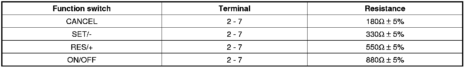 2. Measure resistance between terminals on the control switch when each function switch is ON (switch is depressed).