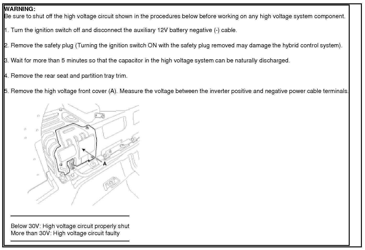 If it is above 30V even though the service disconnect plug is properly removed, there is a fault in the high voltage circuit. In this case, do the DTC troubleshooting first ; don't do any work related to the high voltage system. Serious injury or death could occur due to electrical shock from the high voltage system over 30 volts.