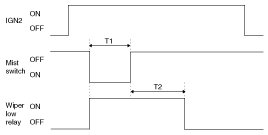 2. Under IGN2 switch ON, Wiper LOW relay is turned ON immediately from Mist switch ON if Mist switch ON for more than T1, Wiper LOW relay is turned OFF after T2 from Mist switch OFF.