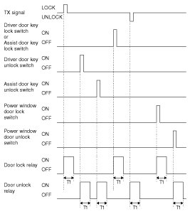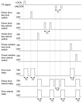 3. Turn Driver Unlock Relay output ON during T2 when receiving TX UNLOCK signal. However, turn Driver Unlock Relay, Unlock Relay (Central Unlock) output during T2 if TX UNLOCK is received within T1.