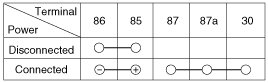 1. There should be continuity between the No.30, 87a and No.87 terminals when power and ground are connected to the No.85 and No.86 terminals.