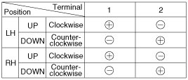 3. Connect the motor terminals directly to battery voltage (12V) and check that the motor operates smoothly. Next, reverse the polarity and check that the motor operates smoothly in the reverse direction. If the operation is abnormal, replace the motor.