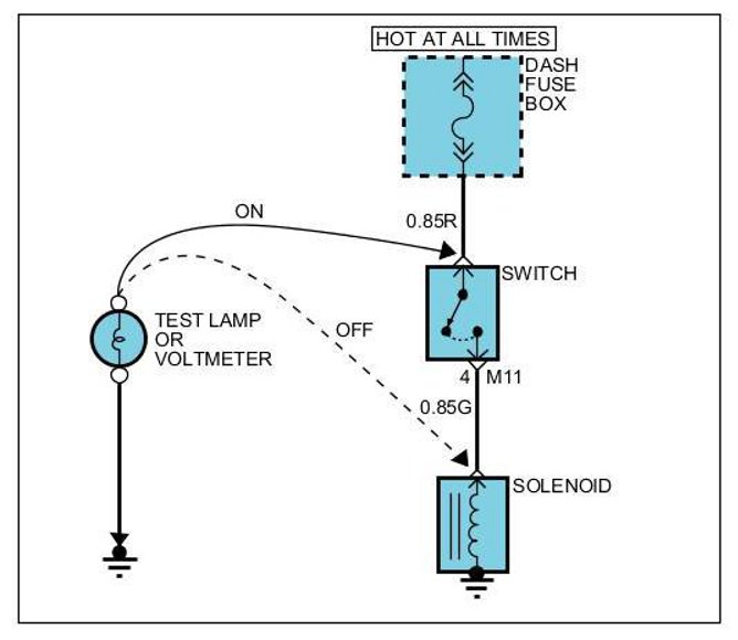 A. Connect one lead of a test lamp or voltmeter to a ground. If you are using a voltmeter, be sure it is the voltmeter's negative test lead you have connected to ground.