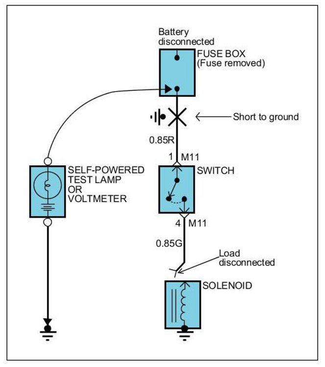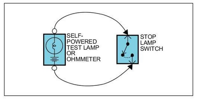 Use a self-powered test lamp or an ohmmeter to check for continuity.
