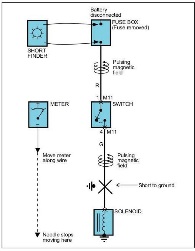 A short finder is available to locate a short to ground. The short finder creates a pulsing magnetic field in the shorted circuit and shows you the location of the short through body trim or sheet metal