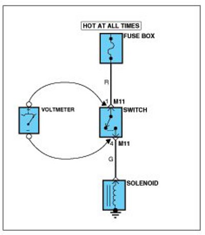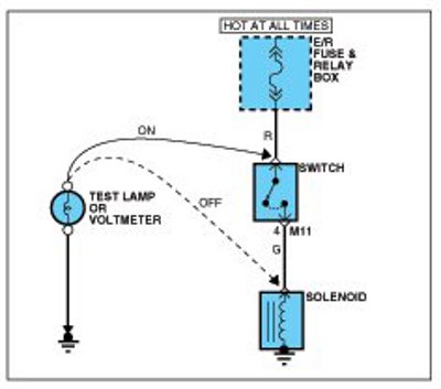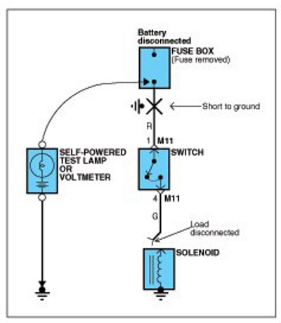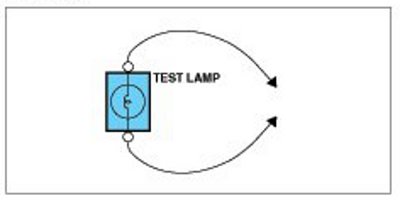A. Connect one lead of a test lamp or voltmeter to a ground. If you are using a voltmeter, be sure it is the voltmeter's negative test lead you have connected to ground.