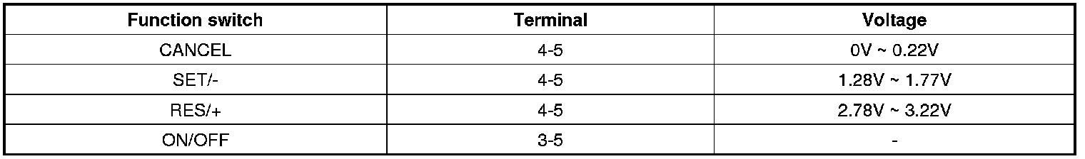 2. Measure voltage between terminals on the harness side connector when each function switch is ON (switch is depressed).