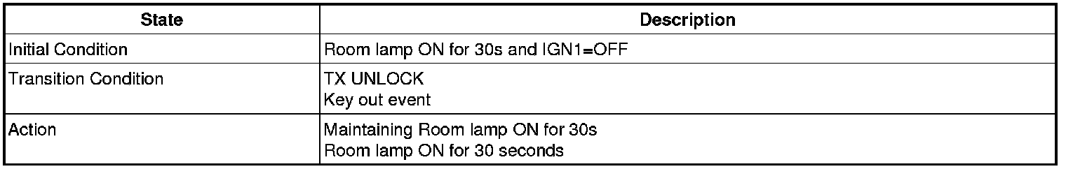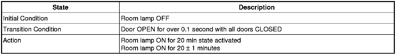 (6) C05: If (ACC=ON or IGN1=ON or IGN2=ON) or (Burglar Alarm state = 1->0) or (Any door close -> open or Tailgate open switch=ON then room lamp auto cut = ON and 20mins timer stop and 3sec timer stop.