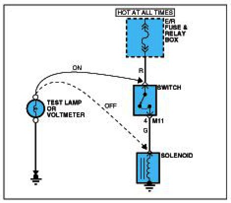 A. Connect one lead of a test lamp or voltmeter to a ground. If you are using a voltmeter, be sure it is the voltmeter's negative test lead you have connected to ground.